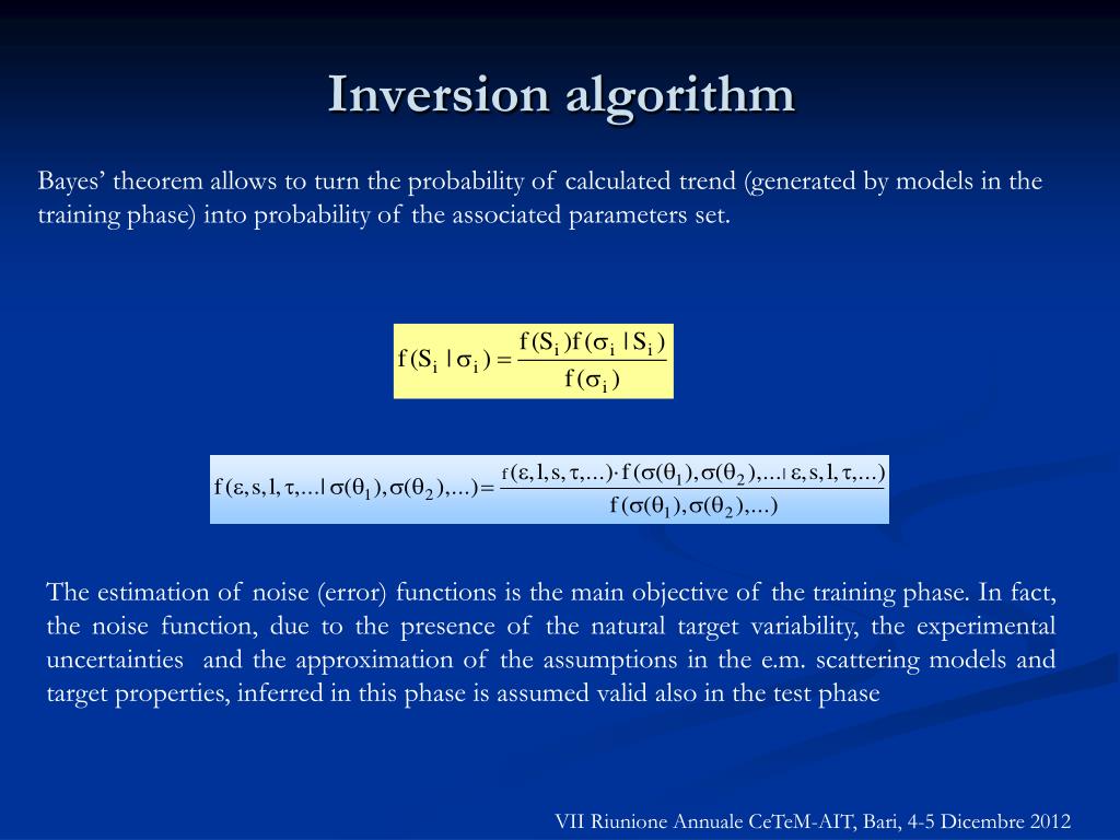 Inversionalgorithm Bayes’ theorem allows to turn the probability of calculated trend (generated by models in the training phase) into probability of the associated parameters set. The estimationofnoise (error) functionsis the mainobjectiveof the training phase. In fact, the noisefunction, due to the presenceof the natural target variability, the experimentaluncertainties and the approximationof the assumptions in the e.m.scatteringmodels and target properties, inferred in thisphaseisassumedvalidalso in the test phase VII RiunioneAnnualeCeTeM-AIT, Bari, 4-5 Dicembre 2012