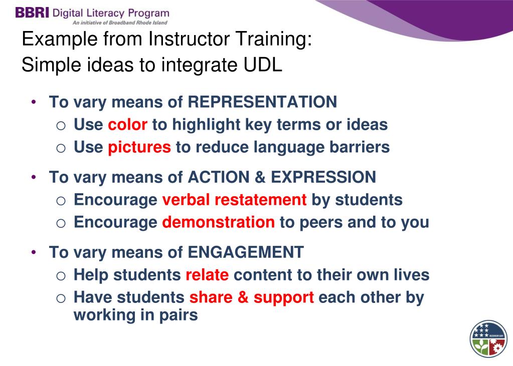 Example from Instructor Training: Simple ideas to integrate UDL To vary means of REPRESENTATION Use color to highlight key terms or ideas Use pictures to reduce language barriers To vary means of ACTION & EXPRESSION Encourage verbal restatement by students Encourage demonstration to peers and to you To vary means of ENGAGEMENT Help students relate content to their own lives Have students share & support each other by working in pairs