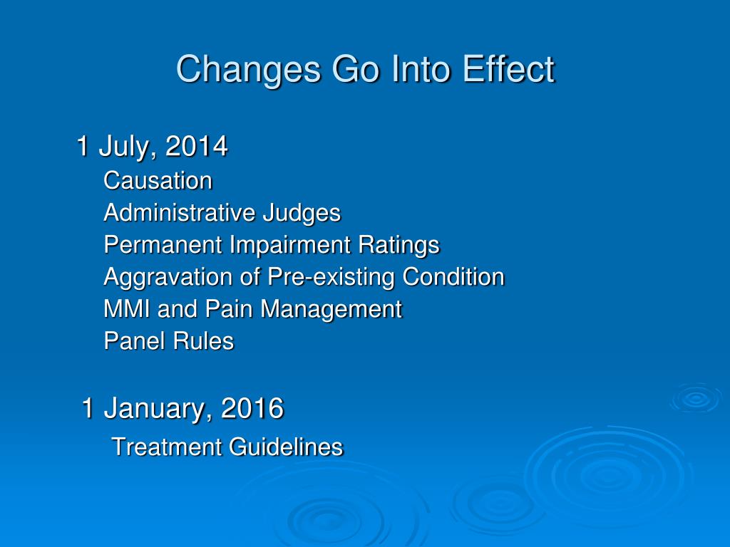 Changes Go Into Effect 1 July, 2014 Causation Administrative Judges Permanent Impairment Ratings Aggravation of Pre-existing Condition MMI and Pain Management Panel Rules 1 January, 2016 Treatment Guidelines
