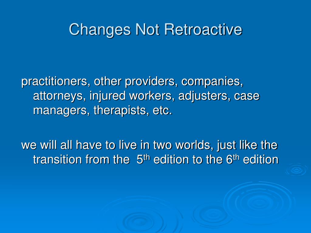Changes Not Retroactive practitioners, other providers, companies, attorneys, injured workers, adjusters, case managers, therapists, etc. we will all have to live in two worlds, just like the transition from the 5th edition to the 6th edition