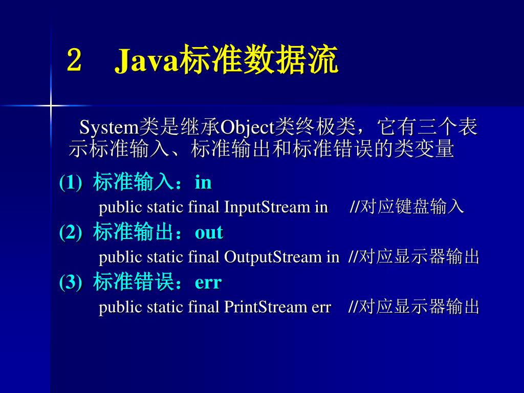 2 Java标准数据流 System类是继承Object类终极类,它有三个表示标准输入、标准输出和标准错误的类变量 (1) 标准输入:in public static final InputStream in //对应键盘输入 (2) 标准输出:out public static final OutputStream in //对应显示器输出 (3) 标准错误:err public static final PrintStream err //对应显示器输出