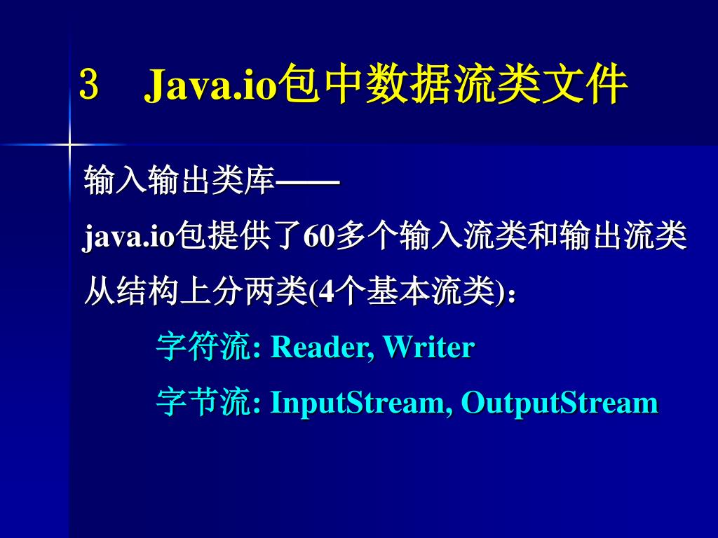3 Java.io包中数据流类文件 输入输出类库—— java.io包提供了60多个输入流类和输出流类 从结构上分两类(4个基本流类): 字符流: Reader, Writer 字节流: InputStream, OutputStream