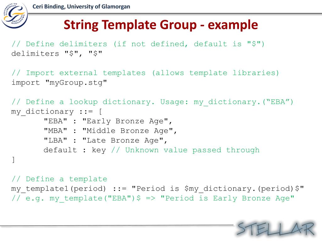 String Template Group - example // Define delimiters (if not defined, default is "$") delimiters "$", "$" // Import external templates (allows template libraries) import "myGroup.stg" // Define a lookup dictionary. Usage: my_dictionary.(“EBA”) my_dictionary ::= [ "EBA" : "Early Bronze Age", "MBA" : "Middle Bronze Age", "LBA" : "Late Bronze Age", default : key // Unknown value passed through ] // Define a template my_template1(period) ::= "Period is $my_dictionary.(period)$" // e.g. my_template("EBA")$ => "Period is Early Bronze Age"