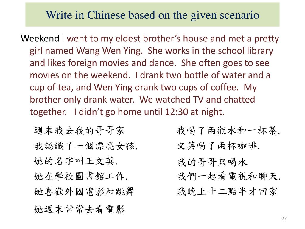 I. Write a conversation between you and your friend Your friend asks what you did on the weekend. Following are the list of things you did. Make up a dialogue based on the info provided. (12 sentences each person) I went to my eldest brother’s house and met a pretty girl named Wang WenZhong. She works in the school library and likes foreign movies and dance. She often goes to see movies on the weekend. I drank two bottle of water and a cup of tea, and WenZhong drank two cups of coffee. My brother only drank water. We watched TV and chatted together. I didn’t go home until 12:30 AM. II. Narrate the following inChinese: