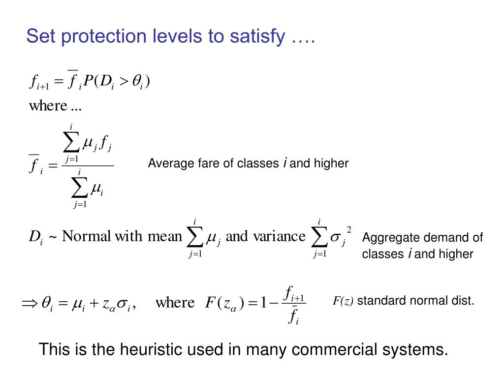 Set protection levels to satisfy …. Average fare of classes i and higher Aggregate demand of classes i and higher F(z) standard normal dist. This is the heuristic used in many commercial systems.