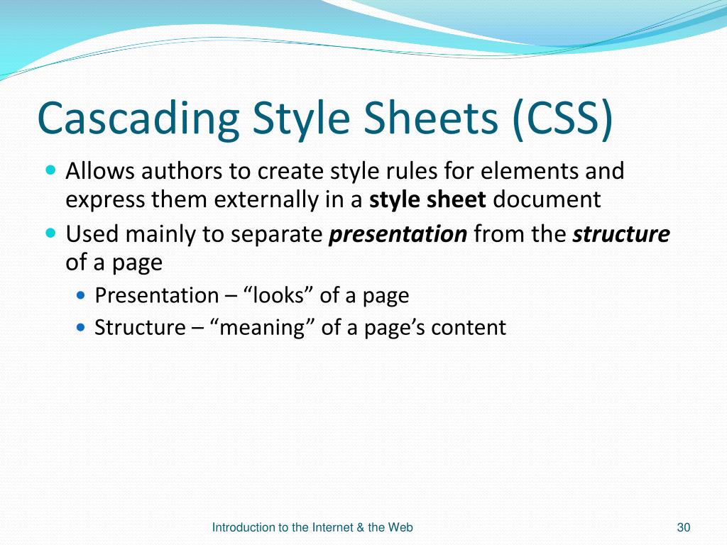 Cascading Style Sheets (CSS) • Allows authors to create style rules for elements and express them externally in a style sheet document • Used mainly to separate presentation from the structure of a page • Presentation – “looks” of a page • Structure – “meaning” of a page’s content Introduction to the Internet & the Web