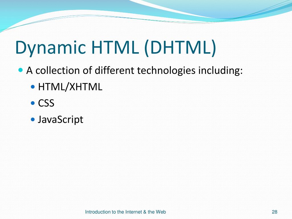 Dynamic HTML (DHTML) • A collection of different technologies including: • HTML/XHTML • CSS • JavaScript Introduction to the Internet & the Web