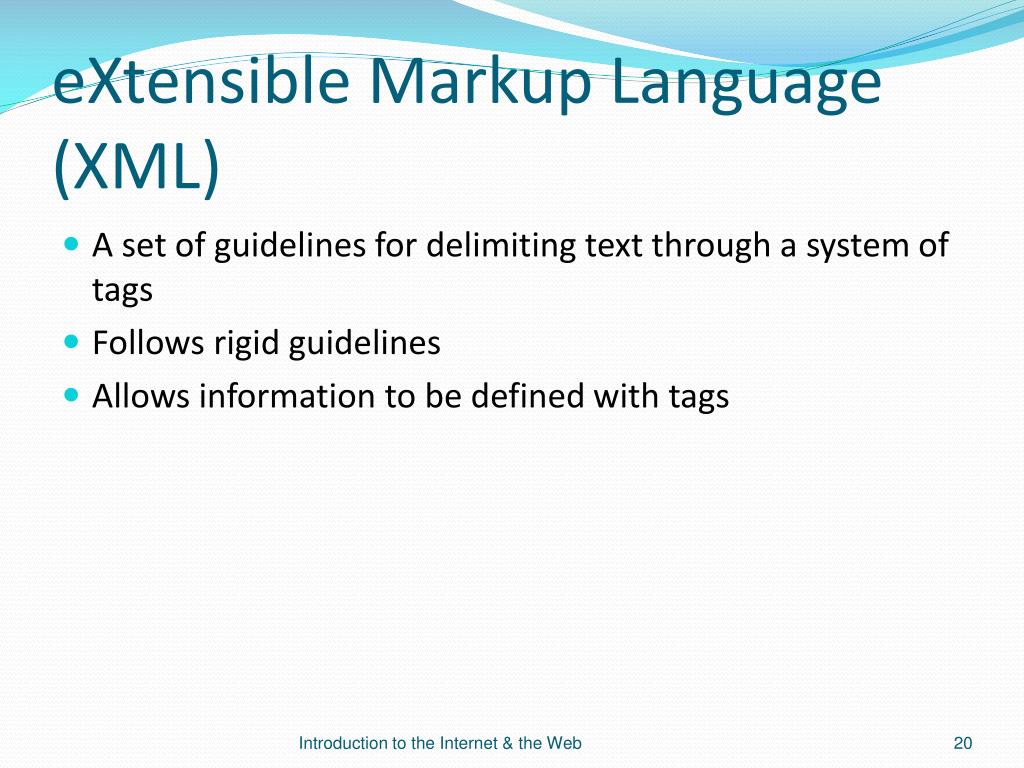 eXtensible Markup Language (XML) • A set of guidelines for delimiting text through a system of tags • Follows rigid guidelines • Allows information to be defined with tags Introduction to the Internet & the Web