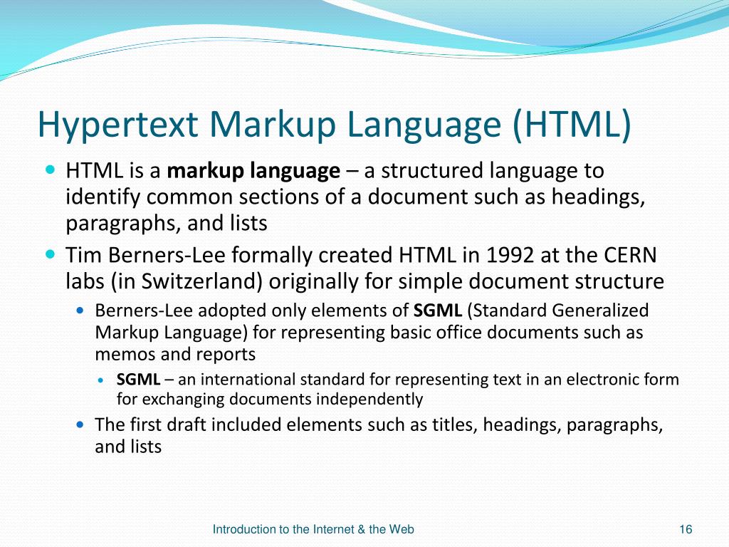 Hypertext Markup Language (HTML) • HTML is a markup language – a structured language to identify common sections of a document such as headings, paragraphs, and lists • Tim Berners-Lee formally created HTML in 1992 at the CERN labs (in Switzerland) originally for simple document structure • Berners-Lee adopted only elements of SGML (Standard Generalized Markup Language) for representing basic office documents such as memos and reports • SGML – an international standard for representing text in an electronic form for exchanging documents independently • The first draft included elements such as titles, headings, paragraphs, and lists Introduction to the Internet & the Web