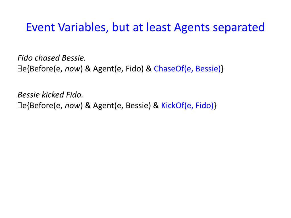Event Variables, but at least Agents separated Fido chased Bessie. e{Before(e, now) & Agent(e, Fido) & ChaseOf(e, Bessie)} Bessie kicked Fido. e{Before(e, now) & Agent(e, Bessie) & KickOf(e, Fido)}