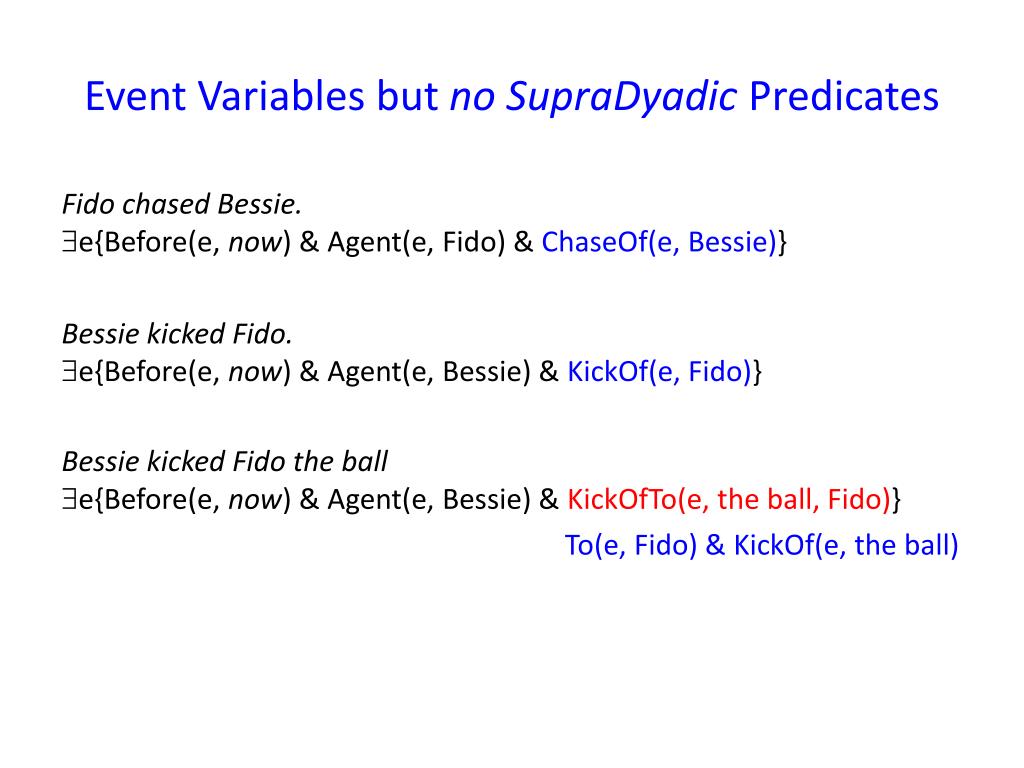 Event Variables but noSupraDyadic Predicates Fido chased Bessie. e{Before(e, now) & Agent(e, Fido) & ChaseOf(e, Bessie)} Bessie kicked Fido. e{Before(e, now) & Agent(e, Bessie) & KickOf(e, Fido)} Bessie kicked Fido the ball e{Before(e, now) & Agent(e, Bessie) & KickOfTo(e, the ball, Fido)} To(e, Fido) & KickOf(e, the ball)