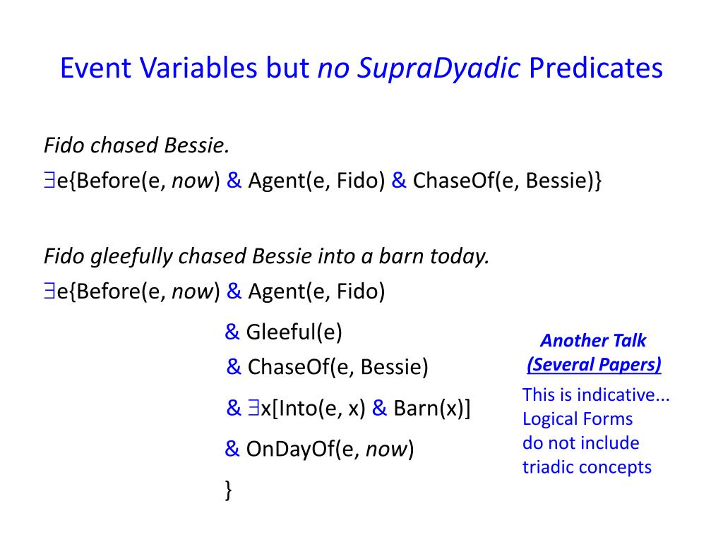 Event Variables but no SupraDyadicPredicates Fido chased Bessie. e{Before(e, now) &Agent(e, Fido) &ChaseOf(e, Bessie)} Fido gleefully chased Bessie into a barn today. e{Before(e, now) &Agent(e, Fido) &Gleeful(e) &ChaseOf(e, Bessie) &x[Into(e, x) &Barn(x)] &OnDayOf(e, now) } Another Talk (Several Papers) This is indicative... Logical Forms do not include triadic concepts