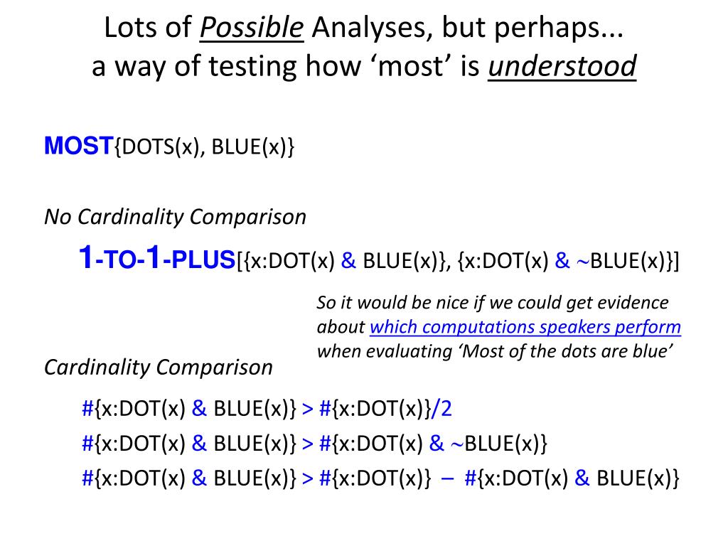 Lots of Possible Analyses MOST{DOTS(x), BLUE(x)} No Cardinality Comparison 1-TO-1-PLUS[{x:DOT(x) &BLUE(x)}, {x:DOT(x) & BLUE(x)}] Cardinality Comparison #{x:DOT(x) &BLUE(x)} > #{x:DOT(x)}/2 #{x:DOT(x) &BLUE(x)} > #{x:DOT(x) & BLUE(x)} #{x:DOT(x) &BLUE(x)} > #{x:DOT(x)} – #{x:DOT(x) &BLUE(x)}