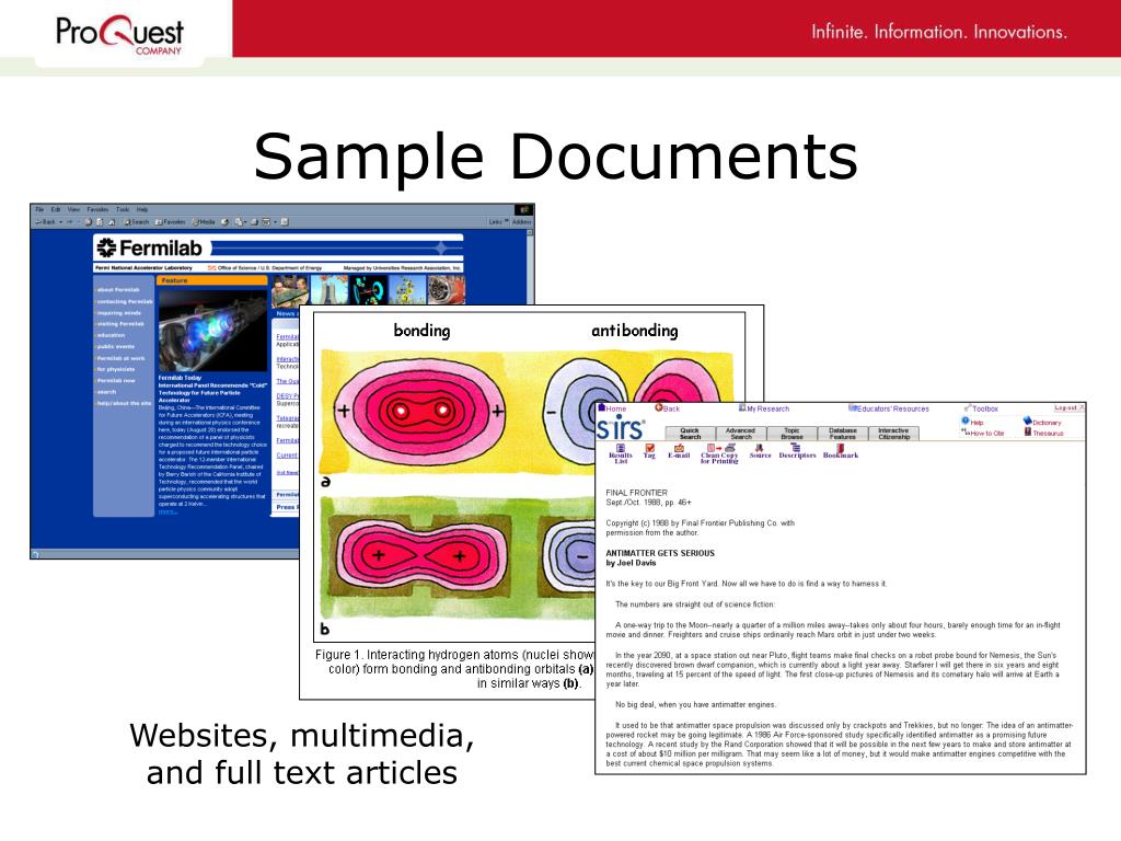 Document Results • Topics lead to related articles, government documents, websites, multimedia sources, and subjects • In this example, we selected subject: Antimatter • Dynamic searches ensure educators can find updated content as new documents are added to SIRS