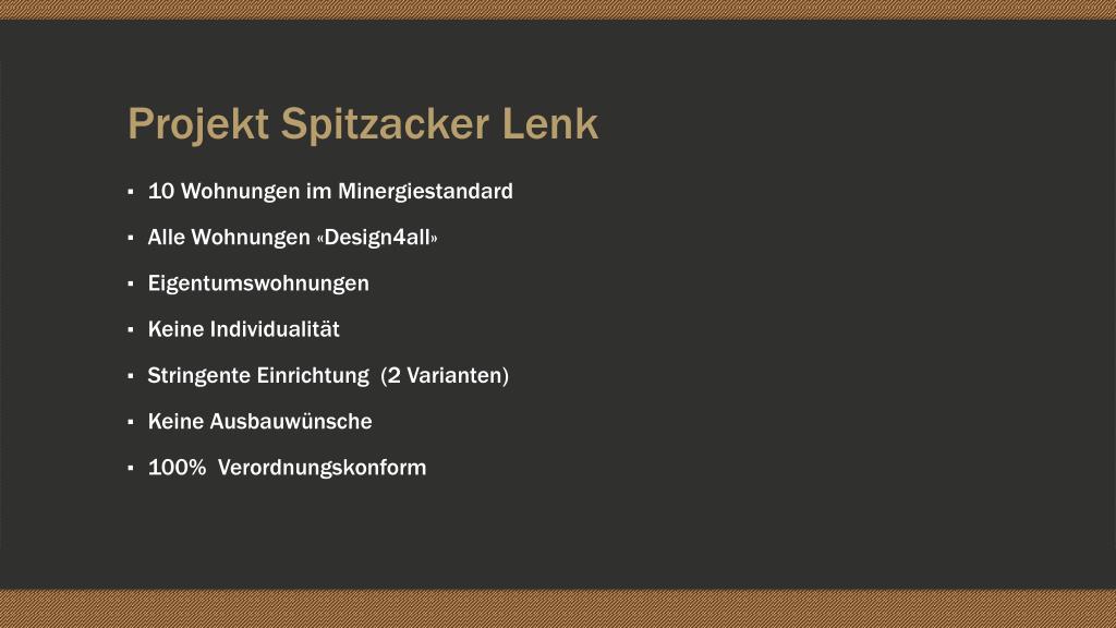 Projekt Spitzacker Lenk • 10 Wohnungen im Minergiestandard • Alle Wohnungen «Design4all» • Eigentumswohnungen • Keine Individualität • Stringente Einrichtung (2 Varianten) • Keine Ausbauwünsche • 100% Verordnungskonform