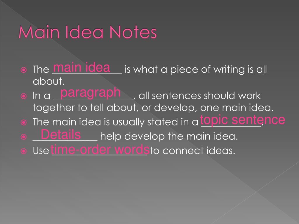 Main Idea Notes main idea • The ______________ is what a piece of writing is all about. • In a ________________, all sentences should work together to tell about, or develop, one main idea. • The main idea is usually stated in a ____________. • _____________ help develop the main idea. • Use ___________________ to connect ideas. paragraph topic sentence Details time-order words