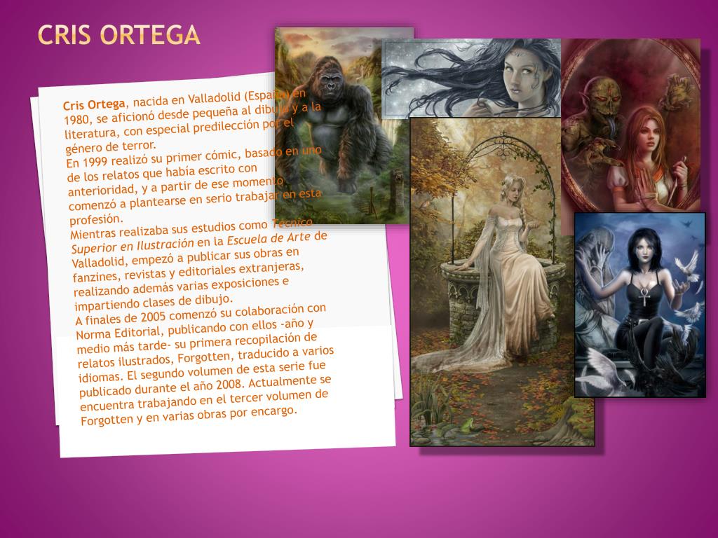 CRIS ORTEGA Cris Ortega, nacida en Valladolid (España) en 1980, se aficionó desde pequeña al dibujo y a la literatura, con especial predilección por el género de terror. En 1999 realizó su primer cómic, basado en uno de los relatos que había escrito con anterioridad, y a partir de ese momento comenzó a plantearse en serio trabajar en esta profesión. Mientras realizaba sus estudios como Técnico Superior en Ilustración en la Escuela de Arte de Valladolid, empezó a publicar sus obras en fanzines, revistas y editoriales extranjeras, realizando además varias exposiciones e impartiendo clases de dibujo. A finales de 2005 comenzó su colaboración con Norma Editorial, publicando con ellos -año y medio más tarde- su primera recopilación de relatos ilustrados, Forgotten, traducido a varios idiomas. El segundo volumen de esta serie fue publicado durante el año 2008. Actualmente se encuentra trabajando en el tercer volumen de Forgotten y en varias obras por encargo.