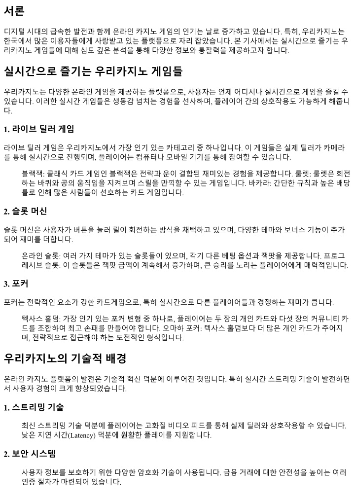 서론 디지털시대의급속한발전과함께온라인카지노게임의인기는날로증가하고있습니다. 특히, 우리카지노는 한국에서많은이용자들에게사랑받고있는플랫폼으로자리잡았습니다. 본기사에서는실시간으로즐기는우 리카지노게임들에대해심도깊은분석을통해다양한정보와통찰력을제공하고자합니다. 실시간으로즐기는우리카지노게임들 우리카지노는다양한온라인게임을제공하는플랫폼으로, 사용자는언제어디서나실시간으로게임을즐길수 있습니다. 이러한실시간게임들은생동감넘치는경험을선사하며, 플레이어간의상호작용도가능하게해줍니 다. 1. 라이브딜러게임 라이브딜러게임은우리카지노에서가장인기있는카테고리중하나입니다. 이게임들은실제딜러가카메라 를통해실시간으로진행되며, 플레이어는컴퓨터나모바일기기를통해참여할수있습니다. 블랙잭: 클래식카드게임인블랙잭은전략과운이결합된재미있는경험을제공합니다. 룰렛: 룰렛은회전 하는바퀴와공의움직임을지켜보며스릴을만끽할수있는게임입니다. 바카라: 간단한규칙과높은배당 률로인해많은사람들이선호하는카드게임입니다. 2. 슬롯머신 슬롯머신은사용자가버튼을눌러릴이회전하는방식을채택하고있으며, 다양한테마와보너스기능이추가 되어재미를더합니다. 온라인슬롯: 여러가지테마가있는슬롯들이있으며, 각기다른베팅옵션과잭팟을제공합니다. 프로그 레시브슬롯: 이슬롯들은잭팟금액이계속해서증가하며, 큰승리를노리는플레이어에게매력적입니다. 3. 포커 포커는전략적인요소가강한카드게임으로, 특히실시간으로다른플레이어들과경쟁하는재미가큽니다. 텍사스홀덤: 가장인기있는포커변형중하나로, 플레이어는두장의개인카드와다섯장의커뮤니티카 드를조합하여최고손패를만들어야합니다. 오마하포커: 텍사스홀덤보다더많은개인카드가주어지 며, 전략적으로접근해야하는도전적인형식입니다. 우리카지노의기술적배경 온라인카지노플랫폼의발전은기술적혁신덕분에이루어진것입니다. 특히실시간스트리밍기술이발전하면 서사용자경험이크게향상되었습니다. 1. 스트리밍기술 최신스트리밍기술덕분에플레이어는고화질비디오피드를통해실제딜러와상호작용할수있습니다. 낮은지연시간(Latency) 덕분에원활한플레이를지원합니다. 2. 보안시스템 사용자정보를보호하기위한다양한암호화기술이사용됩니다. 금융거래에대한안전성을높이는여러 인증절차가마련되어있습니다.