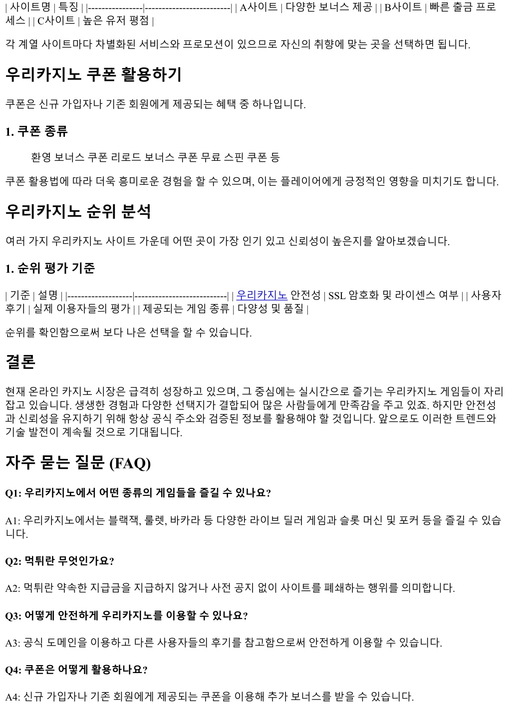 | 사이트명 | 특징 | |----------------|-------------------------| | A사이트 | 다양한보너스제공 | | B사이트 | 빠른출금프로 세스 | | C사이트 | 높은유저평점 | 각계열사이트마다차별화된서비스와프로모션이있으므로자신의취향에맞는곳을선택하면됩니다. 우리카지노쿠폰활용하기 쿠폰은신규가입자나기존회원에게제공되는혜택중하나입니다. 1. 쿠폰종류 환영보너스쿠폰리로드보너스쿠폰무료스핀쿠폰등 쿠폰활용법에따라더욱흥미로운경험을할수있으며, 이는플레이어에게긍정적인영향을미치기도합니다. 우리카지노순위분석 여러가지우리카지노사이트가운데어떤곳이가장인기있고신뢰성이높은지를알아보겠습니다. 1. 순위평가기준 | 기준 | 설명 | |-------------------|---------------------------| | 우리카지노안전성 | SSL 암호화및라이센스여부 | | 사용자 후기 | 실제이용자들의평가 | | 제공되는게임종류 | 다양성및품질 | 순위를확인함으로써보다나은선택을할수있습니다. 결론 현재온라인카지노시장은급격히성장하고있으며, 그중심에는실시간으로즐기는우리카지노게임들이자리 잡고있습니다. 생생한경험과다양한선택지가결합되어많은사람들에게만족감을주고있죠. 하지만안전성 과신뢰성을유지하기위해항상공식주소와검증된정보를활용해야할것입니다. 앞으로도이러한트렌드와 기술발전이계속될것으로기대됩니다. 자주묻는질문 (FAQ) Q1: 우리카지노에서어떤종류의게임들을즐길수있나요? A1: 우리카지노에서는블랙잭, 룰렛, 바카라등다양한라이브딜러게임과슬롯머신및포커등을즐길수있습 니다. Q2: 먹튀란무엇인가요? A2: 먹튀란약속한지급금을지급하지않거나사전공지없이사이트를폐쇄하는행위를의미합니다. Q3: 어떻게안전하게우리카지노를이용할수있나요? A3: 공식도메인을이용하고다른사용자들의후기를참고함으로써안전하게이용할수있습니다. Q4: 쿠폰은어떻게활용하나요? A4: 신규가입자나기존회원에게제공되는쿠폰을이용해추가보너스를받을수있습니다.