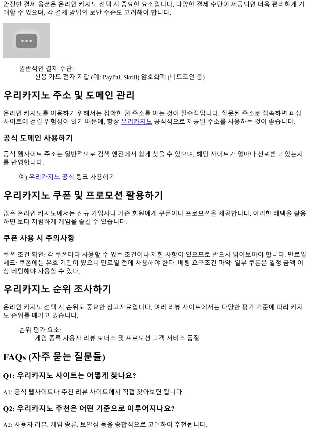 안전한결제옵션은온라인카지노선택시중요한요소입니다. 다양한결제수단이제공되면더욱편리하게거 래할수있으며, 각결제방법의보안수준도고려해야합니다. 일반적인결제수단: 신용카드전자지갑 (예: PayPal, Skrill) 암호화폐 (비트코인등) 우리카지노주소및도메인관리 온라인카지노를이용하기위해서는정확한웹주소를아는것이필수적입니다. 잘못된주소로접속하면피싱 사이트에걸릴위험성이있기때문에, 항상우리카지노공식적으로제공된주소를사용하는것이좋습니다. 공식도메인사용하기 공식웹사이트주소는일반적으로검색엔진에서쉽게찾을수있으며, 해당사이트가얼마나신뢰받고있는지 를반영합니다. 예) 우리카지노공식링크사용하기 우리카지노쿠폰및프로모션활용하기 많은온라인카지노에서는신규가입자나기존회원에게쿠폰이나프로모션을제공합니다. 이러한혜택을활용 하면보다저렴하게게임을즐길수있습니다. 쿠폰사용시주의사항 쿠폰조건확인: 각쿠폰마다사용할수있는조건이나제한사항이있으므로반드시읽어보아야합니다. 만료일 체크: 쿠폰에는유효기간이있으니만료일전에사용해야한다. 베팅요구조건파악: 일부쿠폰은일정금액이 상베팅해야사용할수있다. 우리카지노순위조사하기 온라인카지노선택시순위도중요한참고자료입니다. 여러리뷰사이트에서는다양한평가기준에따라카지 노순위를매기고있습니다. 순위평가요소: 게임종류사용자리뷰보너스및프로모션고객서비스품질 FAQs (자주묻는질문들) Q1: 우리카지노사이트는어떻게찾나요? A1: 공식웹사이트나추천리뷰사이트에서직접찾아보면됩니다. Q2: 우리카지노추천은어떤기준으로이루어지나요? A2: 사용자리뷰, 게임종류, 보안성등을종합적으로고려하여추천됩니다.