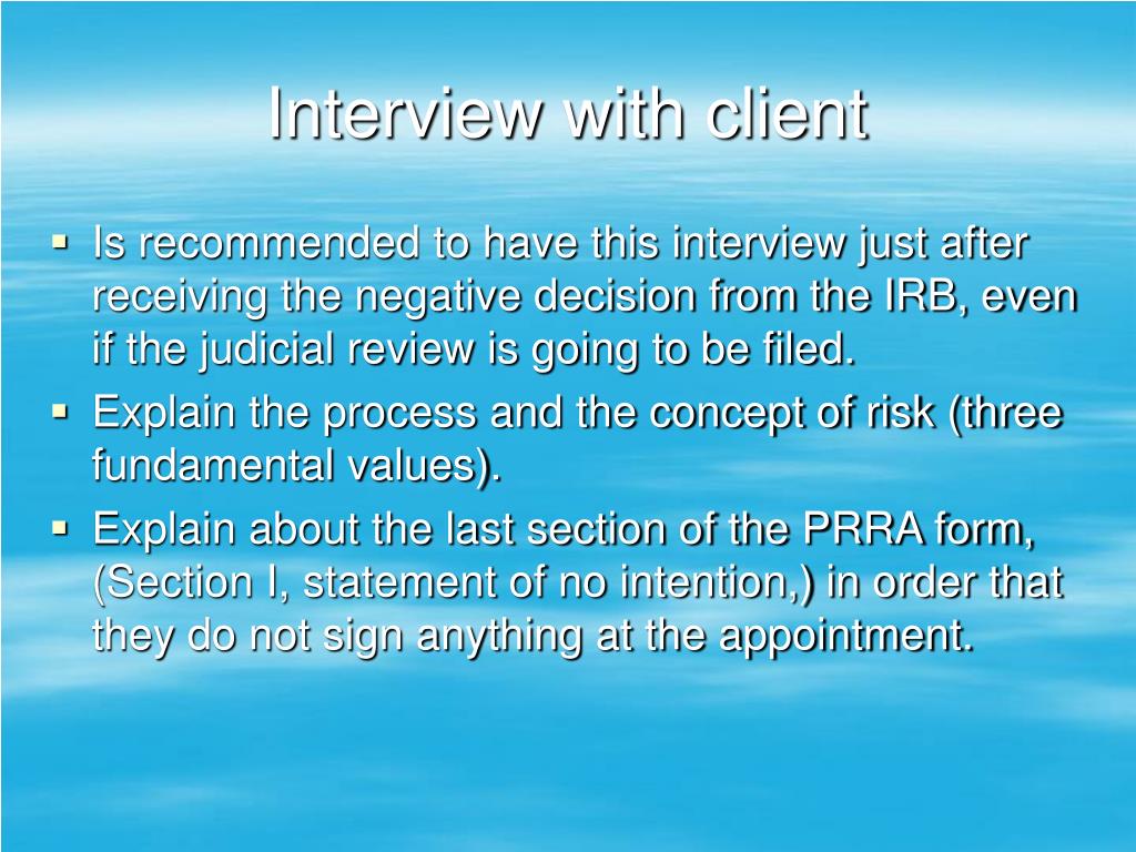 Interview with client • Is recommended to have this interview just after receiving the negative decision from the IRB, even if the judicial review is going to be filed. • Explain the process and the concept of risk (three fundamental values). • Explain about the last section of the PRRA form, (Section I, statement of no intention,) in order that they do not sign anything at the appointment.