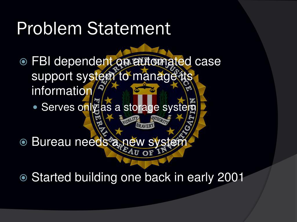 Problem Statement • FBI dependent on automated case support system to manage its information • Serves only as a storage system • Bureau needs a new system • Started building one back in early 2001