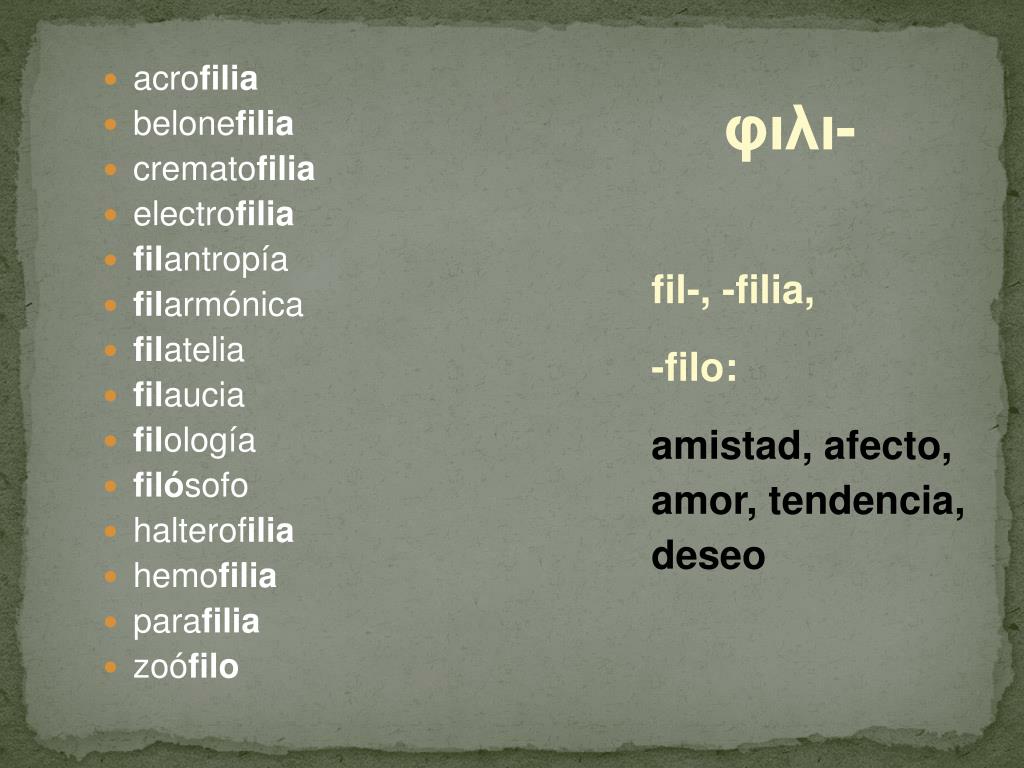 acrofilia • belonefilia • crematofilia • electrofilia • filantropía • filarmónica • filatelia • filaucia • filología • filósofo • halterofilia • hemofilia • parafilia • zoófilo φιλι- fil-, -filia, -filo: amistad, afecto, amor, tendencia, deseo