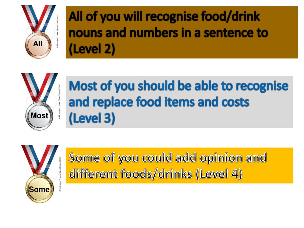 All of you will recognise food/drink nouns and numbers in a sentence to (Level 2) All Most of you should be able to recognise and replace food items and costs (Level 3) Most Some of you could add opinion and different foods/drinks (Level 4) Some