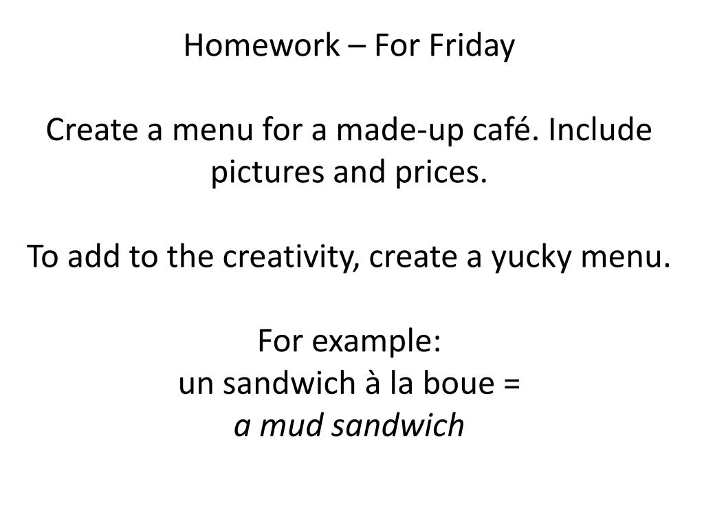 Homework – For Friday Create a menu for a made-up café. Include pictures and prices. To add to the creativity, create a yucky menu. For example:un sandwich à la boue = a mud sandwich