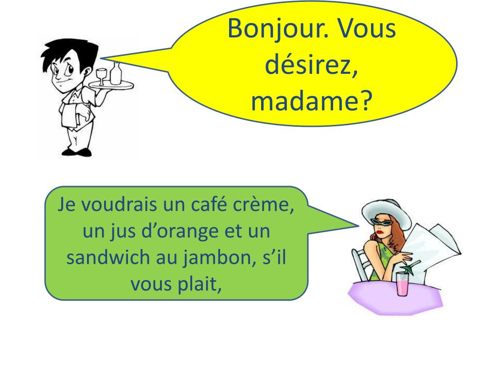 Bonjour. Vousdésirez, madame? Je voudrais un café crème, un jus d’orange et un sandwich au jambon, s’ilvous plait,