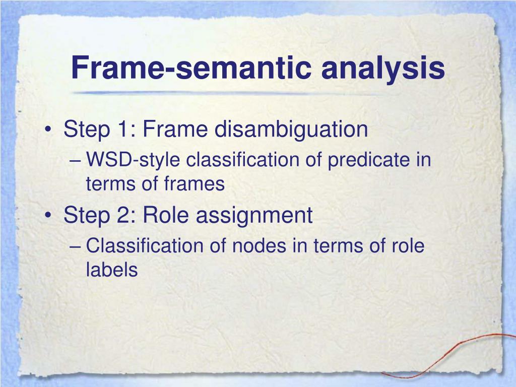 Frame-semantic analysis • Step 1: Frame disambiguation • WSD-style classification of predicate in terms of frames • Step 2: Role assignment • Classification of nodes in terms of role labels
