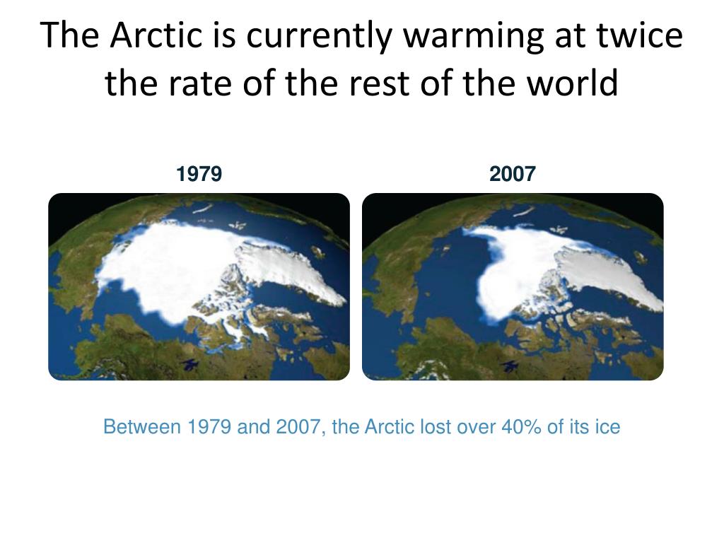 The Arctic is currently warming at twice the rate of the rest of the world 1979 2007 Between 1979 and 2007, the Arctic lost over 40% of its ice