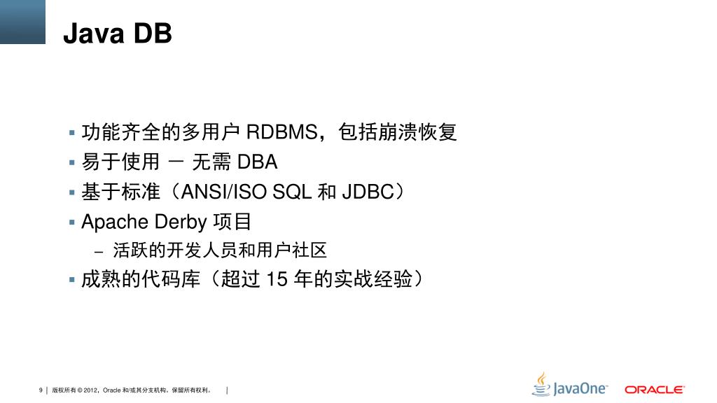 Java DB • 功能齐全的多用户 RDBMS,包括崩溃恢复 • 易于使用 - 无需 DBA • 基于标准(ANSI/ISO SQL 和 JDBC) • Apache Derby 项目 • 活跃的开发人员和用户社区 • 成熟的代码库(超过 15 年的实战经验)