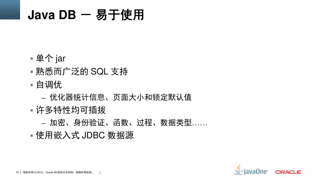 Java DB - 易于使用 • 单个 jar • 熟悉而广泛的 SQL 支持 • 自调优 • 优化器统计信息、页面大小和锁定默认值 • 许多特性均可插拔 • 加密、身份验证、函数、过程、数据类型…… • 使用嵌入式 JDBC 数据源