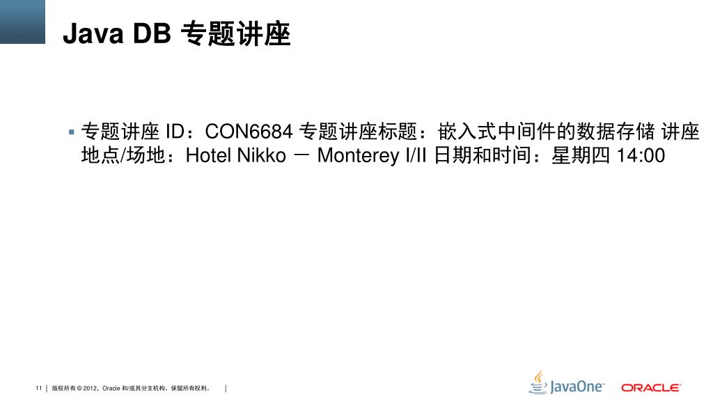 Java DB 专题讲座 • 专题讲座 ID:CON6684 专题讲座标题:嵌入式中间件的数据存储 讲座地点/场地:Hotel Nikko - Monterey I/II 日期和时间:星期四 14:00