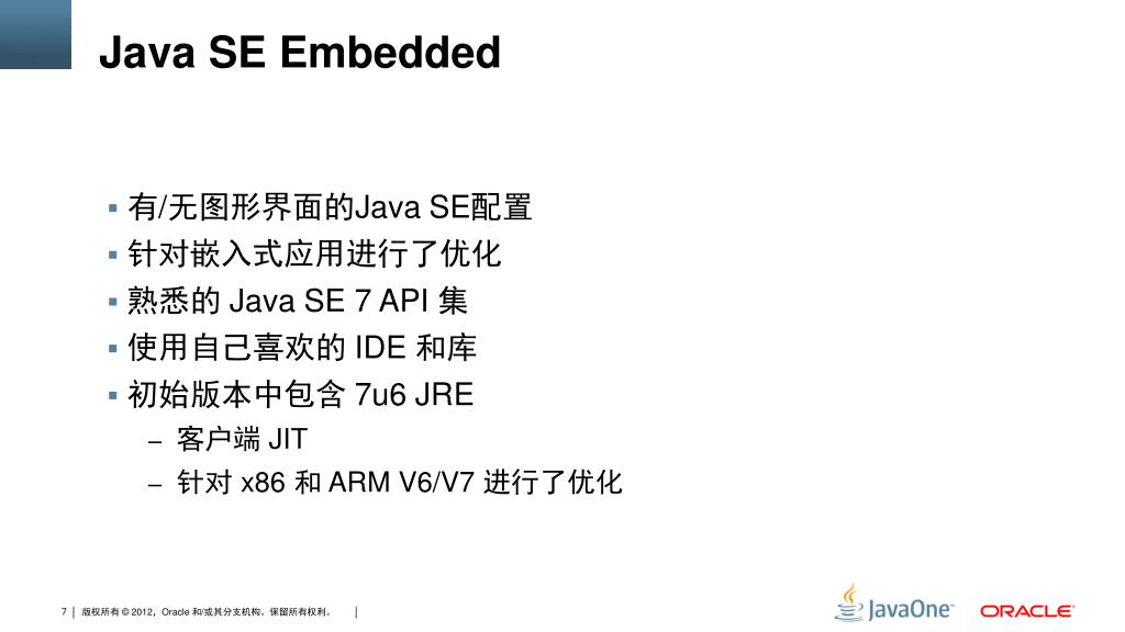 Java SE Embedded • 有/无图形界面的Java SE配置 • 针对嵌入式应用进行了优化 • 熟悉的 Java SE 7 API 集 • 使用自己喜欢的 IDE 和库 • 初始版本中包含 7u6 JRE • 客户端 JIT • 针对 x86 和 ARM V6/V7 进行了优化