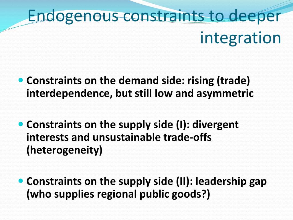 Endogenousconstraintstodeeperintegration • Constraintsonthedemandside: rising (trade) interdependence, butstilllow and asymmetric • Constraintsonthesupplyside (I): divergentinterests and unsustainabletrade-offs (heterogeneity) • Constraintsonthesupplyside (II): leadership gap (whosupplies regional publicgoods?)