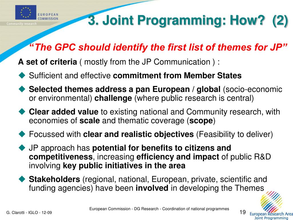 2. Joint Programming : What ? (1) • A Strategic Process • Ambition, • Scope, critical mass, long-term horizon • Clearly defined strategy • A Structured Process • New mindset where Member States consider EU added value, • Sound methodology, appropriate governance structure, • Clear rules of the game • Subsidiarity (EU & MS), Openness, Transparency, Accountability • A Structuring Process • Lasting impact on European research landscape • Creating a new reference frame for public research (ERA Frame) • Lasting, deep commitment from Member States European Commission - DG Research - Coordination of national programmes