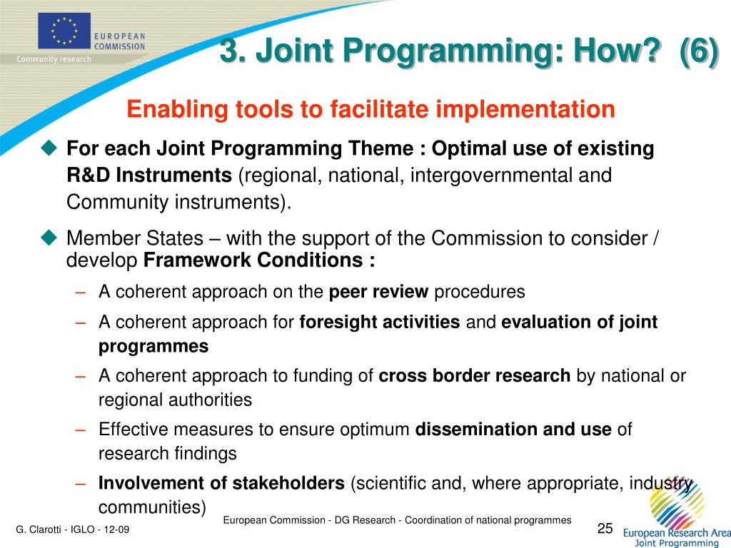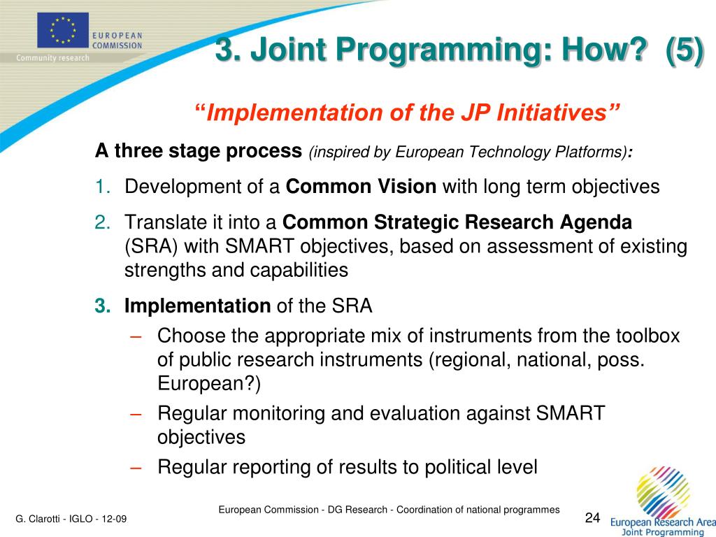 3. Joint Programming: How? (5) “Implementation of the JP Initiatives” A three stage process(inspired by European Technology Platforms): • Development of a Common Vision with long term objectives • Translate it into a Common Strategic Research Agenda (SRA) with SMART objectives, based on assessment of existing strengths and capabilities • Implementation of the SRA • Choose the appropriate mix of instruments from the toolbox of public research instruments (regional, national, poss. European?) • Regular monitoring and evaluation against SMART objectives • Regular reporting of results to political level European Commission - DG Research - Coordination of national programmes