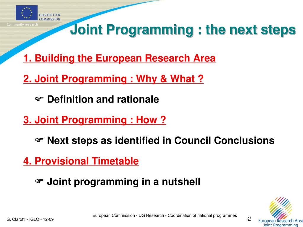 Joint Programming : the next steps 1. Building the European Research Area 2. Joint Programming : Why & What ? Definition and rationale 3. Joint Programming : How ? Next steps as identified in Council Conclusions 4. Provisional Timetable Joint programming in a nutshell European Commission - DG Research - Coordination of national programmes