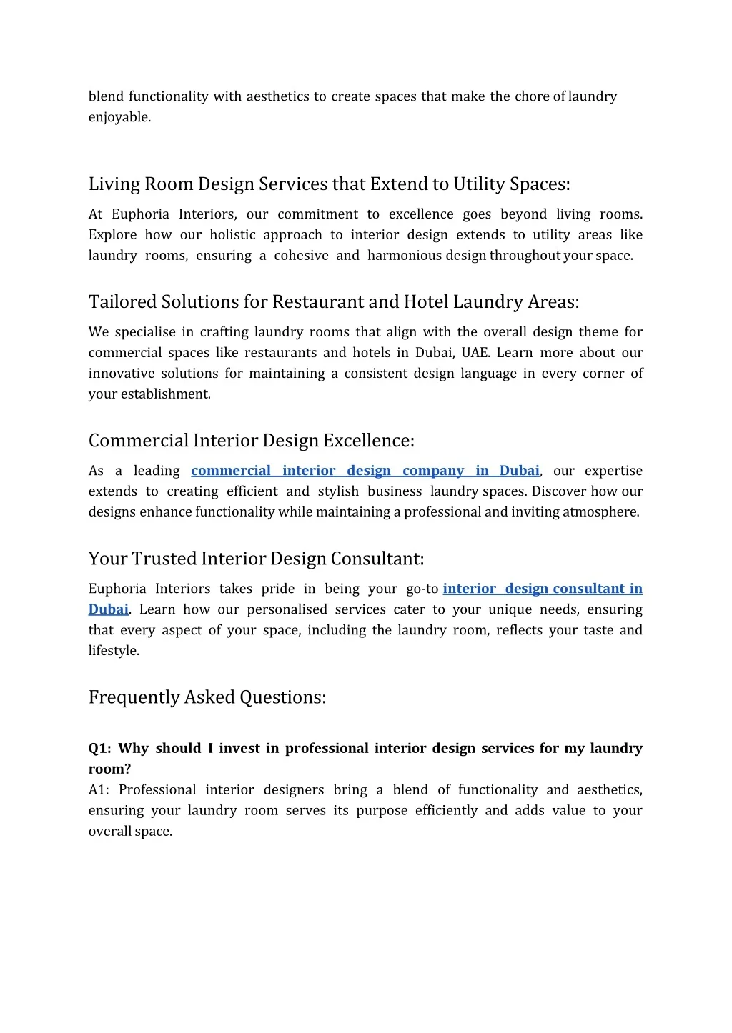 blend functionality with aesthetics to create spaces that make the chore of laundry enjoyable. Living Room Design Services that Extend to Utility Spaces: At Euphoria Interiors, our commitment to excellence goes beyond living rooms. Explore how our holistic approach to interior design extends to utility areas like laundry rooms, ensuring a cohesive and harmonious design throughout your space. Tailored Solutions for Restaurant and Hotel Laundry Areas: We specialise in crafting laundry rooms that align with the overall design theme for commercial spaces like restaurants and hotels in Dubai, UAE. Learn more about our innovative solutions for maintaining a consistent design language in every corner of your establishment. Commercial Interior Design Excellence: As a leading commercial interior design company in Dubai, our expertise extends to creating efficient and stylish business laundry spaces. Discover how our designs enhance functionality while maintaining a professional and inviting atmosphere. Your Trusted Interior Design Consultant: Euphoria Interiors takes pride in being your go-to interior design consultant in Dubai. Learn how our personalised services cater to your unique needs, ensuring that every aspect of your space, including the laundry room, reflects your taste and lifestyle. Frequently Asked Questions: Q1: Why should I invest in professional interior design services for my laundry room? A1: Professional interior designers bring a blend of functionality and aesthetics, ensuring your laundry room serves its purpose efficiently and adds value to your overall space.