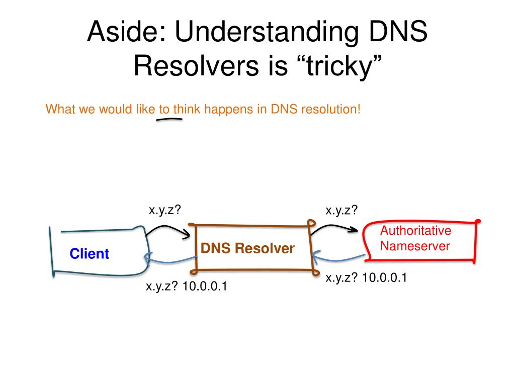 Aside: Understanding DNS Resolvers is “tricky” What we would like to think happens in DNS resolution! x.y.z? x.y.z? Authoritative Nameserver DNS Resolver Client x.y.z? 10.0.0.1 x.y.z? 10.0.0.1