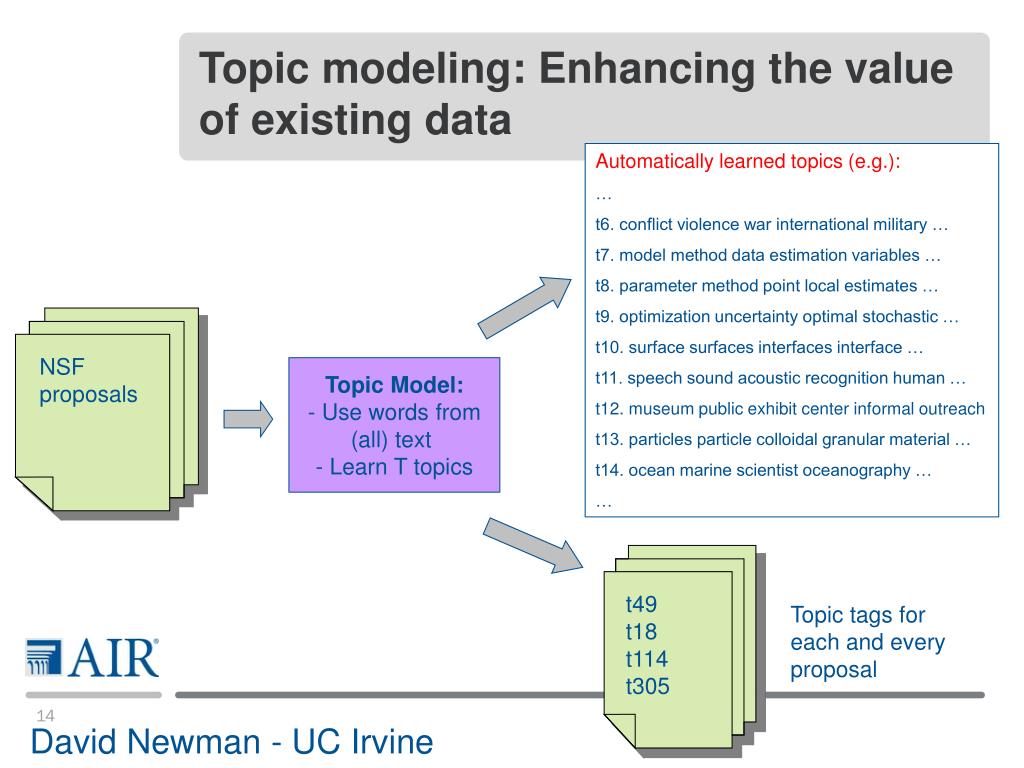 Topic modeling: Enhancing the value of existing data Automatically learned topics (e.g.): … t6. conflict violence war international military … t7. model method data estimation variables … t8. parameter method point local estimates … t9. optimization uncertainty optimal stochastic … t10. surface surfaces interfaces interface … t11. speech sound acoustic recognition human … t12. museum public exhibit center informal outreach t13. particles particle colloidal granular material … t14. ocean marine scientist oceanography … … NSF proposals • Topic Model: • Use words from • (all) text • Learn T topics t49 t18 t114 t305 Topic tags for each and every proposal David Newman - UC Irvine