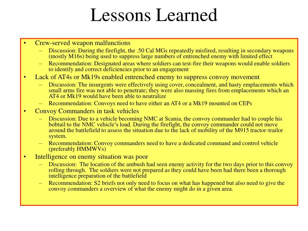 Lessons Learned • Crew-served weapon malfunctions • Discussion: During the firefight, the .50 Cal MGs repeatedly misfired, resulting in secondary weapons (mostly M16s) being used to suppress large numbers of entrenched enemy with limited effect • Recommendation: Designated areas where soldiers can test-fire their weapons would enable soldiers to identify and correct deficiencies prior to an engagement • Lack of AT4s or Mk19s enabled entrenched enemy to suppress convoy movement • Discussion: The insurgents were effectively using cover, concealment, and hasty emplacements which small arms fire was not able to penetrate; they were also massing fires from emplacements which an AT4 or Mk19 would have been able to neutralize • Recommendation: Convoys need to have either an AT4 or a Mk19 mounted on CEPs • Convoy Commanders in task vehicles • Discussion: Due to a vehicle becoming NMC at Scania, the convoy commander had to couple his bobtail to the NMC vehicle’s load. During the firefight, the convoy commander could not move around the battlefield to assess the situation due to the lack of mobility of the M915 tractor-trailor system. • Recommendation: Convoy commanders need to have a dedicated command and control vehicle (preferably HMMWVs) • Intelligence on enemy situation was poor • Discussion: The location of the ambush had seen enemy activity for the two days prior to this convoy rolling through. The soldiers were not prepared as they could have been had there been a thorough intelligence preparation of the battlefield • Recommendation: S2 briefs not only need to focus on what has happened but also need to give the convoy commanders a overview of what the enemy might do in a given area.