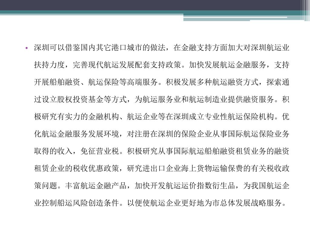 深圳可以借鉴国内其它港口城市的做法,在金融支持方面加大对深圳航运业扶持力度,完善现代航运发展配套支持政策。加快发展航运金融服务,支持开展船舶融资、航运保险等高端服务。积极发展多种航运融资方式,探索通过设立股权投资基金等方式,为航运服务业和航运制造业提供融资服务。积极研究有实力的金融机构、航运企业等在深圳成立专业性航运保险机构。优化航运金融服务发展环境,对注册在深圳的保险企业从事国际航运保险业务取得的收入,免征营业税。积极研究从事国际航运船舶融资租赁业务的融资租赁企业的税收优惠政策,研究进出口企业海上货物运输保费的有关税收政策问题。丰富航运金融产品,加快开发航运运价指数衍生品,为我国航运企业控制船运风险创造条件。以便使航运企业更好地为市总体发展战略服务。深圳可以借鉴国内其它港口城市的做法,在金融支持方面加大对深圳航运业扶持力度,完善现代航运发展配套支持政策。加快发展航运金融服务,支持开展船舶融资、航运保险等高端服务。积极发展多种航运融资方式,探索通过设立股权投资基金等方式,为航运服务业和航运制造业提供融资服务。积极研究有实力的金融机构、航运企业等在深圳成立专业性航运保险机构。优化航运金融服务发展环境,对注册在深圳的保险企业从事国际航运保险业务取得的收入,免征营业税。积极研究从事国际航运船舶融资租赁业务的融资租赁企业的税收优惠政策,研究进出口企业海上货物运输保费的有关税收政策问题。丰富航运金融产品,加快开发航运运价指数衍生品,为我国航运企业控制船运风险创造条件。以便使航运企业更好地为市总体发展战略服务。