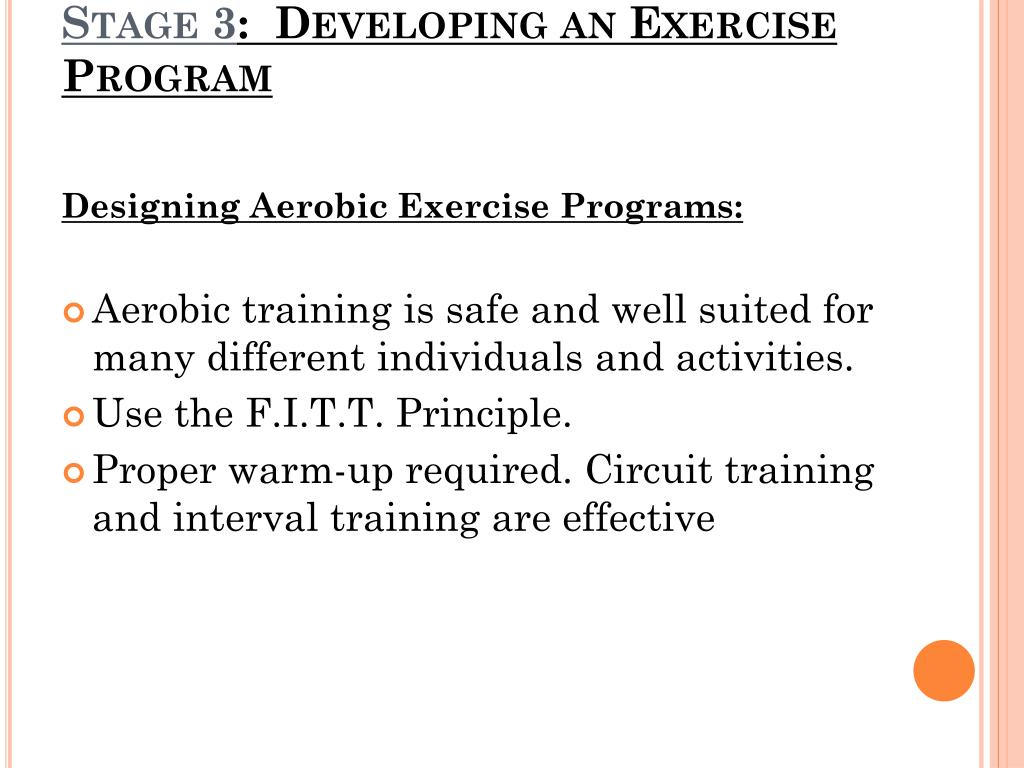 Stage 3: Developing an Exercise Program Designing Aerobic Exercise Programs: • Aerobic training is safe and well suited for many different individuals and activities. • Use the F.I.T.T. Principle. • Proper warm-up required. Circuit training and interval training are effective