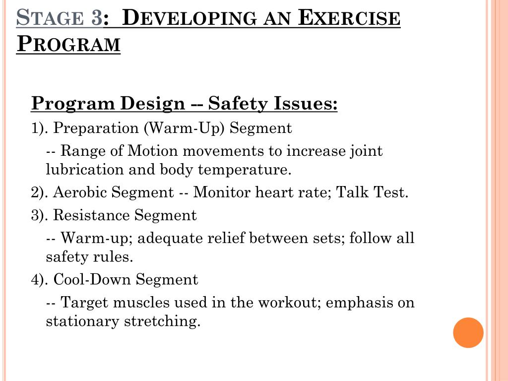 Stage 3: Developing an Exercise Program Program Design -- Safety Issues: 1). Preparation (Warm-Up) Segment -- Range of Motion movements to increase joint lubrication and body temperature. 2). Aerobic Segment -- Monitor heart rate; Talk Test. 3). Resistance Segment -- Warm-up; adequate relief between sets; follow all safety rules. 4). Cool-Down Segment -- Target muscles used in the workout; emphasis on stationary stretching.