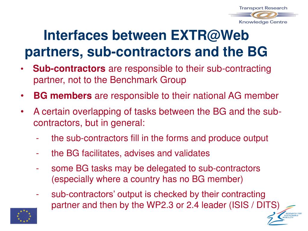 Interfaces between EXTR@Web partners, sub-contractors and the BG • Sub-contractors are responsible to their sub-contracting partner, not to the Benchmark Group • BG members are responsible to their national AG member • A certain overlapping of tasks between the BG and the sub- contractors, but in general: • the sub-contractors fill in the forms and produce output • the BG facilitates, advises and validates • some BG tasks may be delegated to sub-contractors (especially where a country has no BG member) • sub-contractors’ output is checked by their contracting partner and then by the WP2.3 or 2.4 leader (ISIS / DITS)
