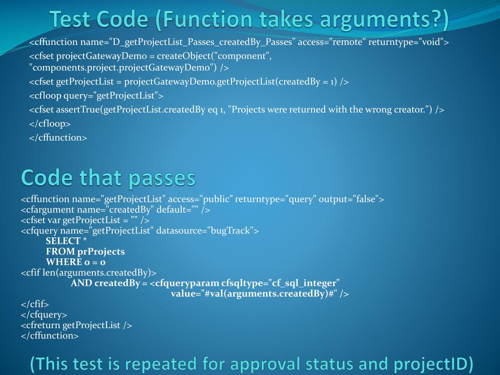 Test Code (Function takes arguments?) Code that passes <cffunction name="D_getProjectList_Passes_createdBy_Passes" access="remote" returntype="void"> <cfset projectGatewayDemo = createObject("component", "components.project.projectGatewayDemo") /> <cfset getProjectList = projectGatewayDemo.getProjectList(createdBy = 1) /> <cfloop query="getProjectList"> <cfset assertTrue(getProjectList.createdBy eq 1, "Projects were returned with the wrong creator.") /> </cfloop> </cffunction> • <cffunction name="getProjectList" access="public" returntype="query" output="false"> • <cfargument name="createdBy" default="" /> • <cfsetvargetProjectList = "" /> • <cfquery name="getProjectList" datasource="bugTrack"> • SELECT * • FROM prProjects • WHERE 0 = 0 • <cfiflen(arguments.createdBy)> • AND createdBy = <cfqueryparamcfsqltype="cf_sql_integer" value="#val(arguments.createdBy)#" /> • </cfif> • </cfquery> • <cfreturngetProjectList /> • </cffunction> (This test is repeated for approval status and projectID)