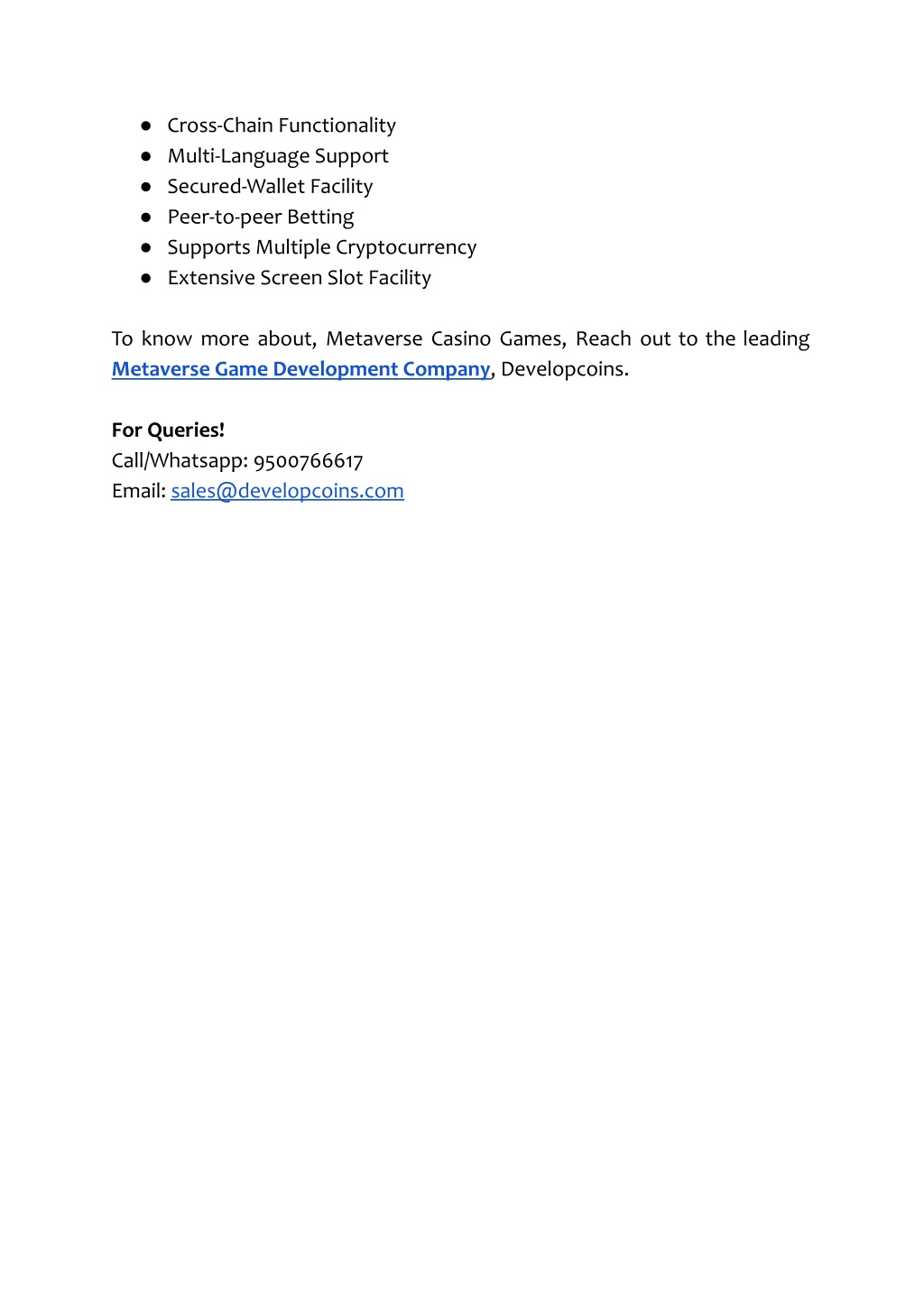 ● Cross-Chain Functionality ● Multi-Language Support ● Secured-Wallet Facility ● Peer-to-peer Betting ● Supports Multiple Cryptocurrency ● Extensive Screen Slot Facility To know more about, Metaverse Casino Games, Reach out to the leading Metaverse Game Development Company, Developcoins. For Queries! Call/Whatsapp: 9500766617 Email: sales@developcoins.com